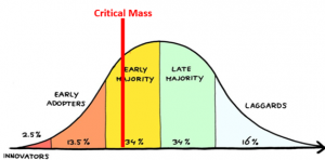 Critical Mass: A sufficient number of adopters of an innovation so that the rate of adoption becomes self-sustaining and creates further growth. – Typically, 10-25% of the population