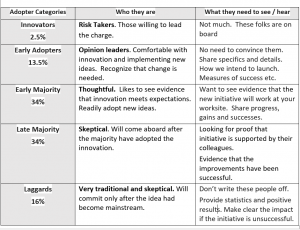 Through additional research, we also learn that certain characteristics are shared among those who comprise these 5 adopter categories: Innovators, Early Adopters, Early Majority, Late Majority and Laggards. In the chart below, you can compare the differing descriptions of each adopter category and what additional information they may require to respond positively to the innovation, new program or improvement initiative.